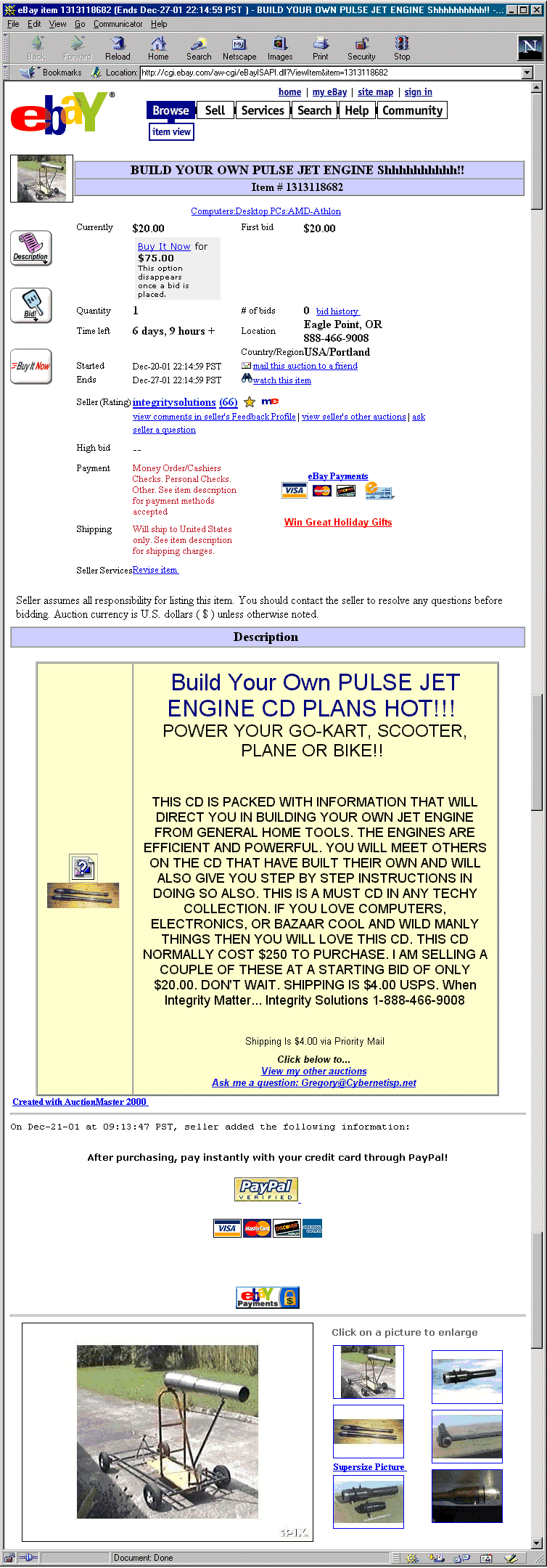 Who's Stealing My Stuff Today? There is at least one, and possibly other CDROMs out there which contain unauthorized copies of information from this website and others. One purchaser of such a CDROM (who claims he wasn't aware that the material had been pirated) came to my attention after several people reported this eBay auction was carrying pictures of my Jet-kart. I've been in touch with the person concerned and he said that the auction was simply an attempt to resell a couple of CDs he bought in good faith from someone calling themselves Candice Wilson whose email address is candysc@sc.rr.com. I'm following up on this and will take action as necessary to protect my rights.