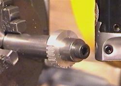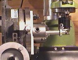 Finding gears of suitable size, pitch and ratios turned out to be a very difficult task so I figured I'd make my own -- creating an interesting exercise in using my mill. The method I'm using is a technique that utilizes a single-point cutter mounted in a boring head. The gear blank is turned to size on the lathe and then mounted on a special shaft I turned up to do the job. This effectively clamped the gear blank very firmly and then the shaft itself was placed in the 3-jaw chuck on my 8" rotary table.