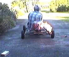Now I have an uncompleted, but pulse jet powered, kart! However, after going to all this trouble I discovered that my propane tank is so close to empty that I can't get enough pressure to run the engine up to full power. So here it is -- the "I cant wait, pre-turbine" version with comfortable wooden plank seating and near-empty fuel-tank.