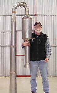 The only "store-bought" parts were the mandrel-drawn U-bend. Unfortunately I couldn't get a 180 degree bend so ended up having to weld two 90 degree bends together. I checked that the inside of the join was smooth and without any roughness so as not to upset the gasflow at this high-velocity point. I built the engine exactly as to Lockwood's own plans -- with the exception of the fuel injector. No fuel injection method is actually shown on the plans but I understand that most builders use a couple of tubes mounted at the widest point of the front cone. These tubes are at 90 degrees to each other (thus forming an 'X') and are slit along their length so that liquid propane is sprayed into the chamber. For my engine I built a single-point, radial spray nozzle that produces a flat, 180 degree spray pattern at the same point (directly in line with the joint between the front cone and the combustion chamber. This nozzle did cause some problems -- but I fixed them fairly easily.