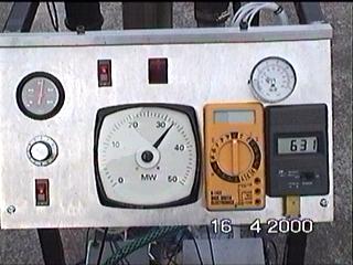 16 April 2000 -- Latest Runs In this image you can see the fiber-optic pickup lead which picks up light reflected from the compressor turbine nut. I painted the nut half black and half white to provide the strongest possible signal. Even so, I had to build an extra stage of amplification into my tachometer circuit in order to get a nice reliable reading under overcast skies. I installed the pickup by drilling a 3mm hole down the center out of a 5mm hex-socket head machine screw (to take the fiber) and then drilling and tapping the intake tube so that I could screw the machine screw into position. In order to grip the fiber strongly I used the sleeve of a pop rivet which was a snug fit into the head of the screw. I lightly crimped the pop rivet sleeve around the fiber and this means it all hangs together very nicely -- but it's still very quick and easy to remove if necessary. Boy... what a surprise -- the engine idles at 60,000 RPMs and this is the lowest sustainable speed. Even at this speed I have to be careful to keep the oil pressure at 30 PSI or below or it starts losing RPMs. At idle the compressor is producing 5 PSI of pressure and the exhaust temp is around 650 degrees Celsius.